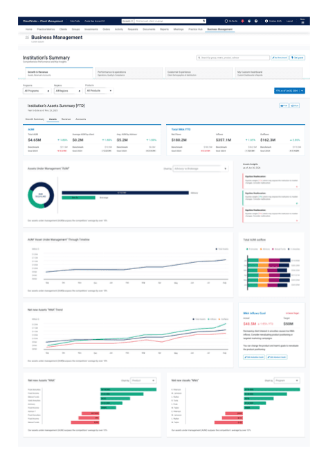 Growth & Revenue Tracking – Real-time monitoring of AUM, NNA, revenue trends, and advisor performance across programs and regions.Performance & Operational Insights – Visualizing team efficiency, NIGO rates, ACAT processing times, and compliance trends to identify bottlenecks.